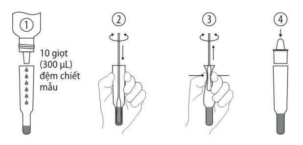 - Nhúng đầu que mẫu vào ống chiết. Xoay và miết đầu que vào thành và đáy ống 10 lần. Để đầu que ngâm trong dung dịch 1 phút
