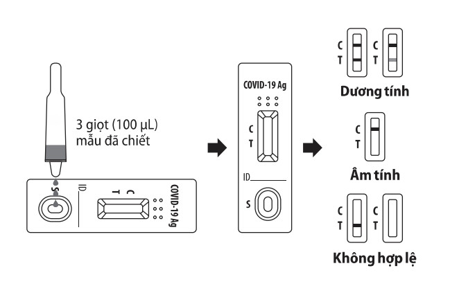 - Nhỏ 3 giọt mẫu chiết từ ống vào ô nhận mẫu (S) của khay thử và bắt đầu đếm thời gian