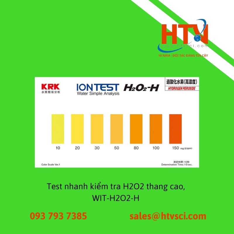Test nhanh kiểm tra H2O2 thang cao của hãng KASAHARA (KRK) là test H2O2 thang cao được sử dụng kiểm tra bán định lượng peroxit trong nước và nước thải. Bộ test H2O2 được đóng gói nhỏ gọn bao gồm 50 gói thuốc thử và các dụng củ cần thiết kèm theo.