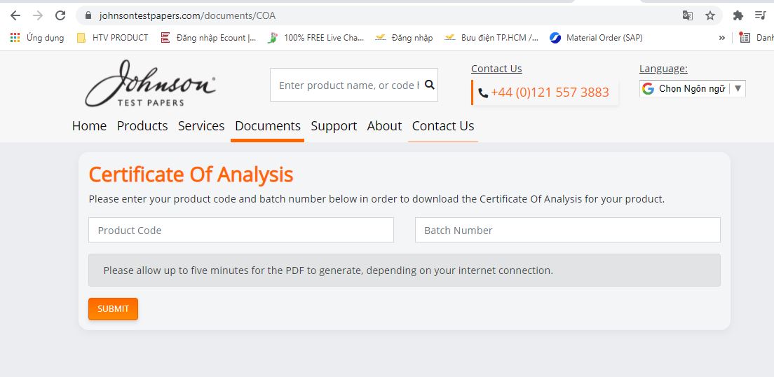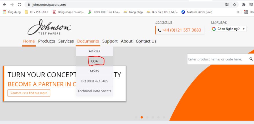 Bước 1: Vào trang web chính của hãng Johnson test papers Tại đây