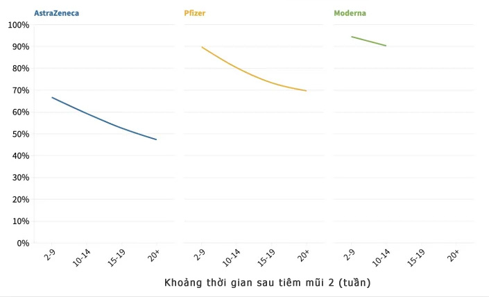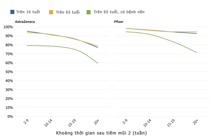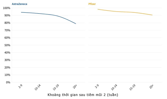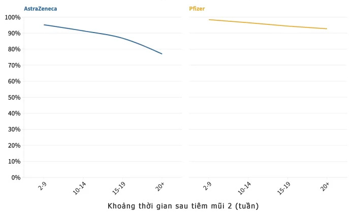 Sau 2 tháng, cả hai loại vắc xin đều giảm khả năng ngăn ngừa bệnh có triệu chứng. Sau 20 tuần, hiệu quả của AstraZeneca còn 50%, Pfizer còn 70%.
