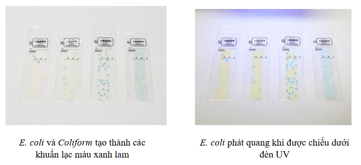 E. coli và Coliform tạo thành các khuẩn lạc màu xanh lam. Hơn nữa, vi khuẩn E. coli phát quang khi được chiếu dưới tia cực tím của đèn UV.