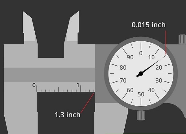 Bước 8: Kết quả cộng được nhân với 0,001, ta sẽ thu được kết quả thực. Ví dụ: Bạn có thể thấy trên hình, thước chính đọc được là 1,3 inch, kim đồng hồ là 0,015 ich. Kết quả thu được là 1,315 inch.