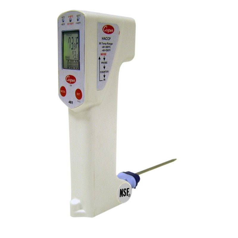 Nhiệt kế hồng ngoại 481 Cooper atkins hay Máy đo nhiệt độ từ xa được thiết kế 2 trong 1 có thể đo nhiệt độ bề mặt và nhiệt độ bên trong thực phẩm với đầu dò RTD. Nhiệt kế hồng ngoại 481 có đèn báo màu xanh và màu đỏ để báo hiệu thực phẩm có trong vùng an toàn trong kiểm tra HACCP. Nhiệt kế hồng ngoại 481 với khả năng chống nước IPX65 cùng các tính năng trên tạo thành thiết bị đo nhiệt độ hoàn hảo cho ngành thực phẩm.
