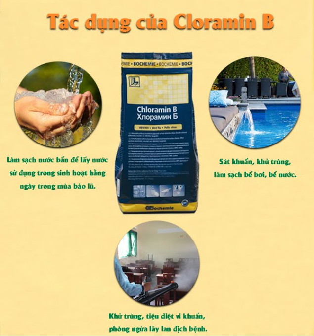 - Hơn thế nữa Chloramin B còn góp phần không nhỏ trong việc làm sạch môi trường sau những đợt dịch bệnh gia súc, gia cầm, sau khi có lũ lụt, lũ quét: Tiệt trùng và tẩy uế các khu vực dịch bệnh bùng phát.