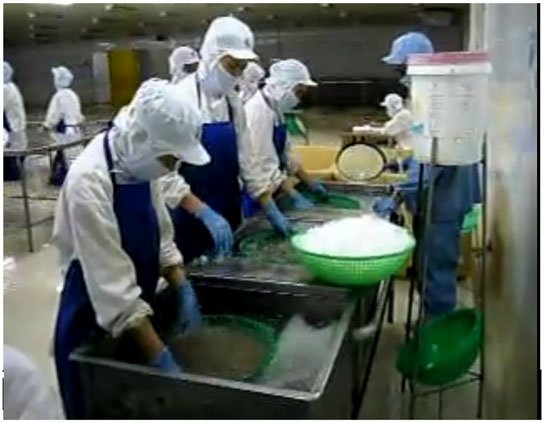 Nguyên liệu sau khi tiếp nhận được đưa sang thùng rửa, không được đưa các phương tiện vào phân xưởng sản xuất. thùng rửa làm bằng thép không gỉ. Sức chứa của thùng có thể từ 50-500kg tuỳ việc bốc dỡ bằng cơ khí hay bằng tay. Thùng rửa được đặt trong bể nước lưu động. Nước đá dùng để ước tôm trong lúc vận chuyển và rác bẩn sẽ nổi lên trên mặt nước và được vớt ra cho vào thùng chứa rác thải.