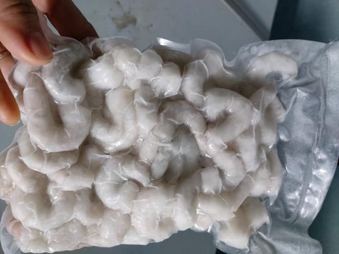 Khối tôm được bọc túi nilông, hàn kín để không cho sản phẩm tiếp xúc với không khí bên ngoài