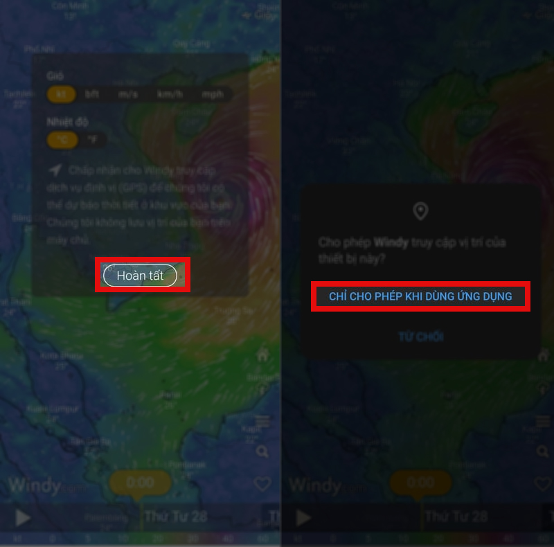 Bước 2: Sau khi cài đặt xong hãy đồng ý cấp quyền truy cập vị trí cho ứng dụng để nó dự đoán thời tiết ở khu vực của bạn nhé. Chọn vào Hoàn tất > Chỉ cho phép khi sử dụng ứng dụng.
