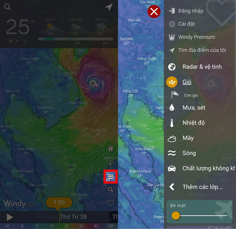 Bước 3: Bạn có thể chọn một trong các thông tin để theo dõi như gió, mưa, sét, mây,... bằng cách chọn vào dấu 3 gạch ngang rồi chọn vào thông tin bạn muốn theo dõi.