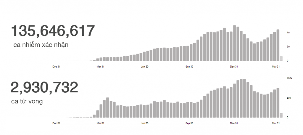 Hình 1. Biểu đồ số ca nhiễm và tử vong do COVID-19 trên toàn thế giới (cập nhật ngày 12/4/2021)