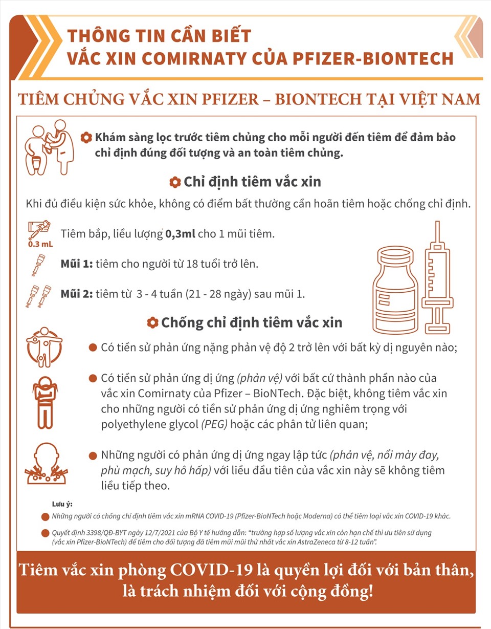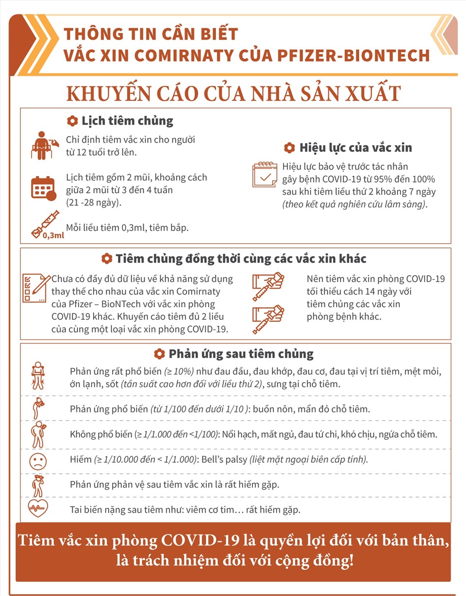 Vaccine COVID-19 Pfizer/BioNtech có chỉ định tiêm cho người 12 tuổi trở lên. Hiệu lực bảo vệ trước tác nhân gây bệnh COVID-19 từ 95% đến 100% sau khi tiêm liều thứ 2 khoảng 7 ngày.