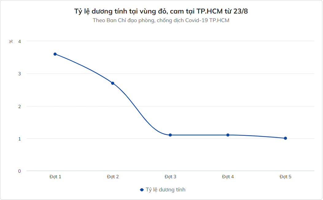 %Tỷ lệ dương tính tại vùng đỏ, cam tại TP.HCM từ 23/8Theo Ban Chỉ đạo phòng, chống dịch Covid-19 TP.HCMTỷ lệ dương tínhĐợt 1Đợt 2Đợt 3Đợt 4Đợt 501234